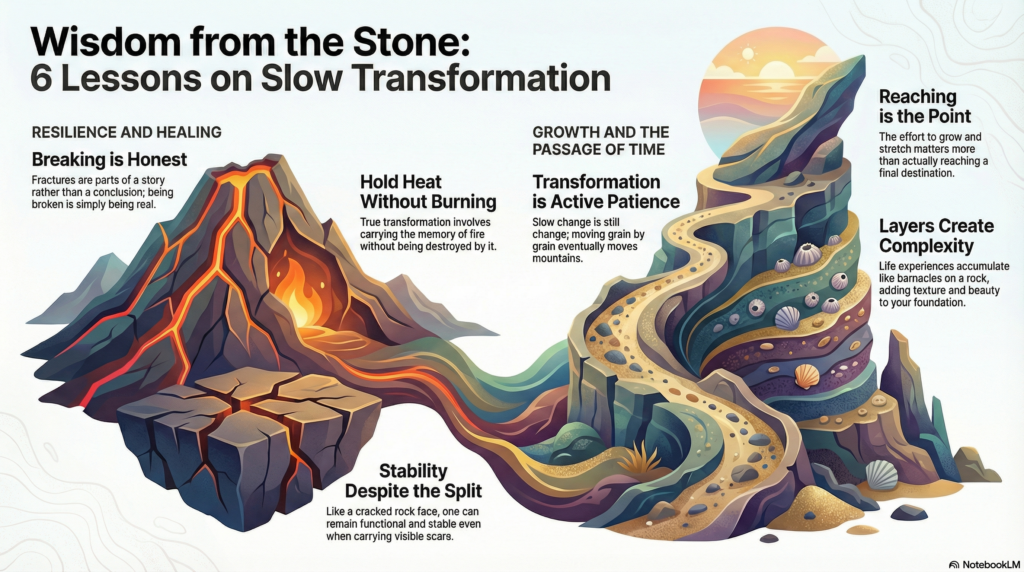 Except that is not quite right either. Rock does yield. Just slowly. On timescales human bodies do not easily register. Wind erodes rock grain by grain. Water wears channels through stone. The mountain I am sitting on was once seafloor, thrust up by tectonic forces that continue to reshape this landscape, imperceptibly, constantly.