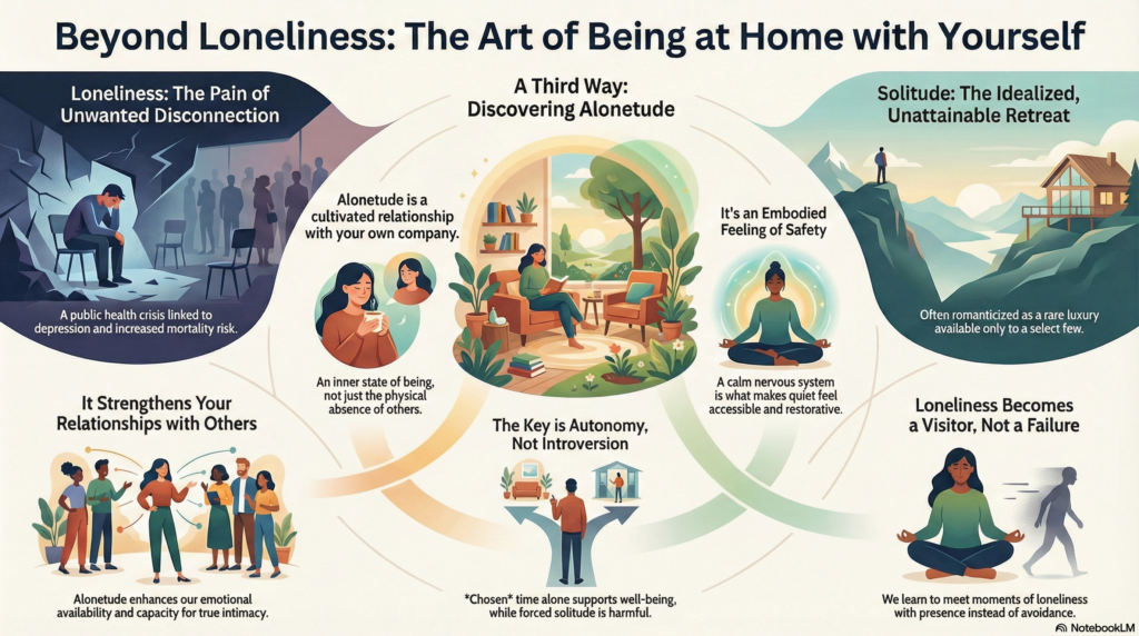 In this sense, alonetude is an embodied practice. It develops through repeated experiences of staying present long enough for the body to register safety, rather than through insight alone.