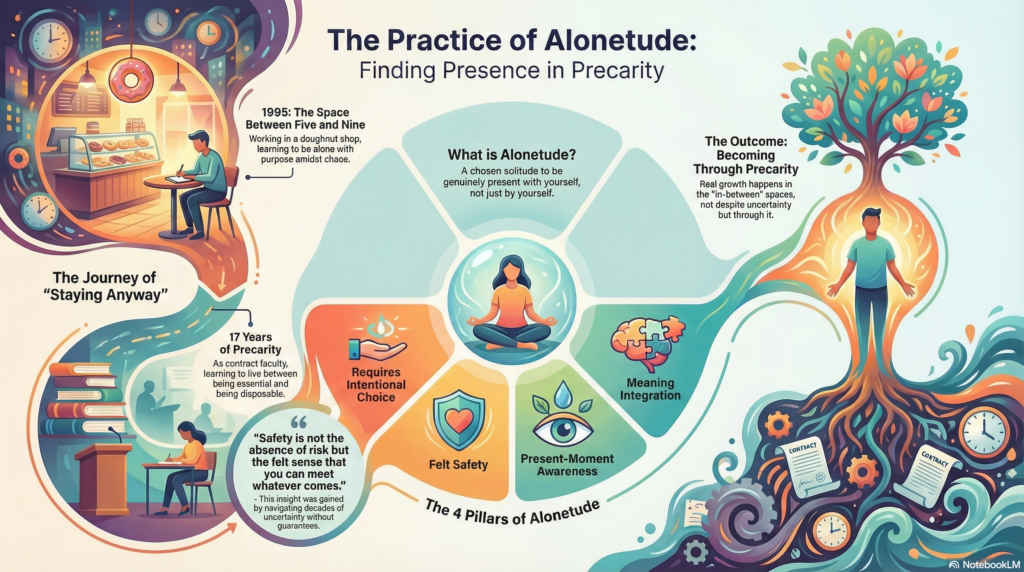I do not know what next semester holds. I do not know if the applications I have submitted will lead to interviews, to offers, to the security I have worked toward for decades. What I know is that I have learned to stay anyway. I have learned that the space between five and nine, between uncertainty and meaning, between isolation and alonetude, is where the real work happens. It is where we become the people we are trying to be, not despite the precarity but through it.