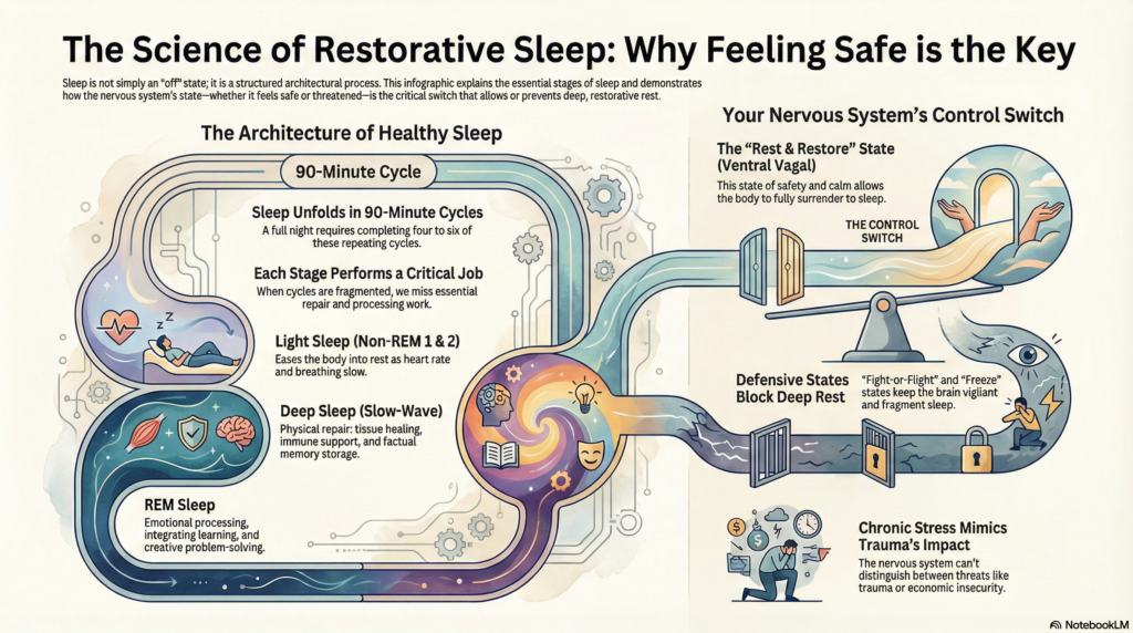 The research on trauma makes this relationship very clear. People diagnosed with post-traumatic stress disorder, or PTSD, show severely disrupted sleep across multiple measures. Their sleep architecture looks broken. They obtain significantly less slow-wave sleep, resulting in less physical restoration. Their REM sleep is highly fragmented, compromising emotional processing. They wake frequently during the night, driven by what researchers call autonomic hyperarousal, the nervous system’s persistent scanning for threat operating even during sleep (Germain, 2013; Mellman et al., 2002; van der Kolk, 2014).